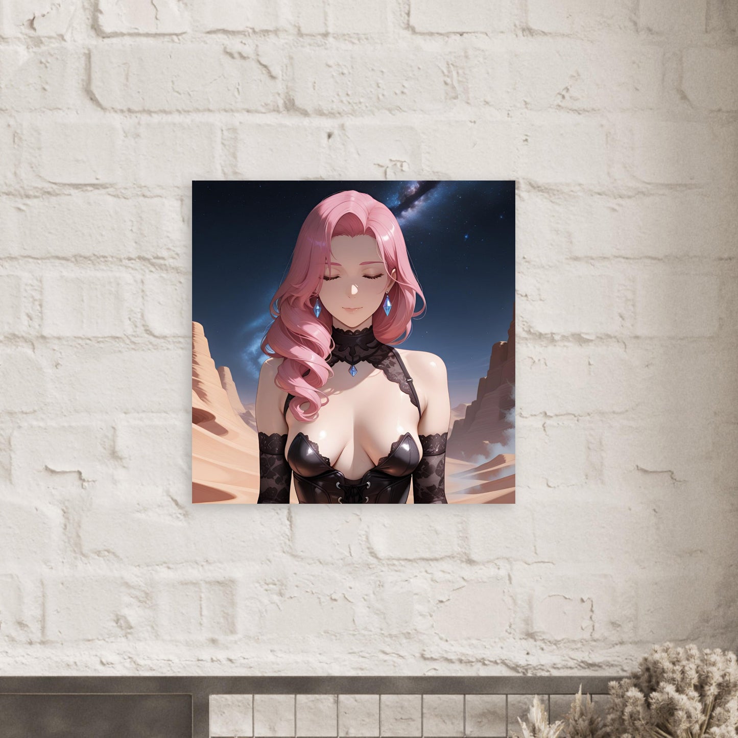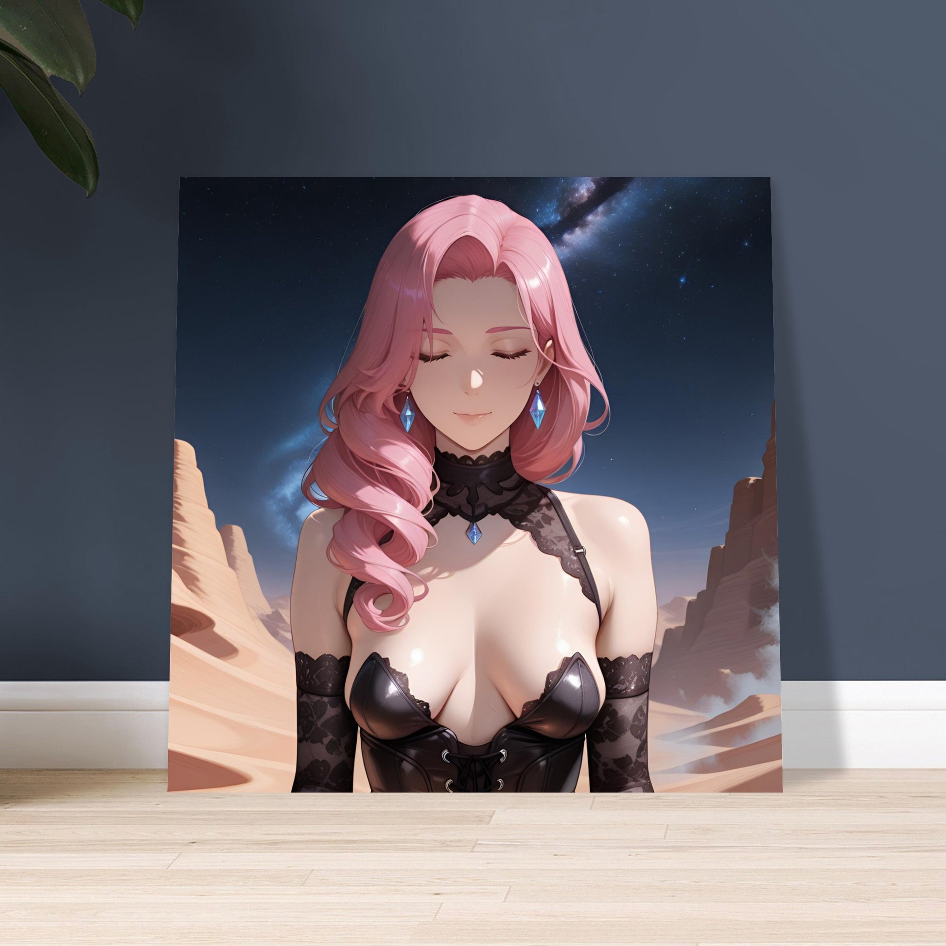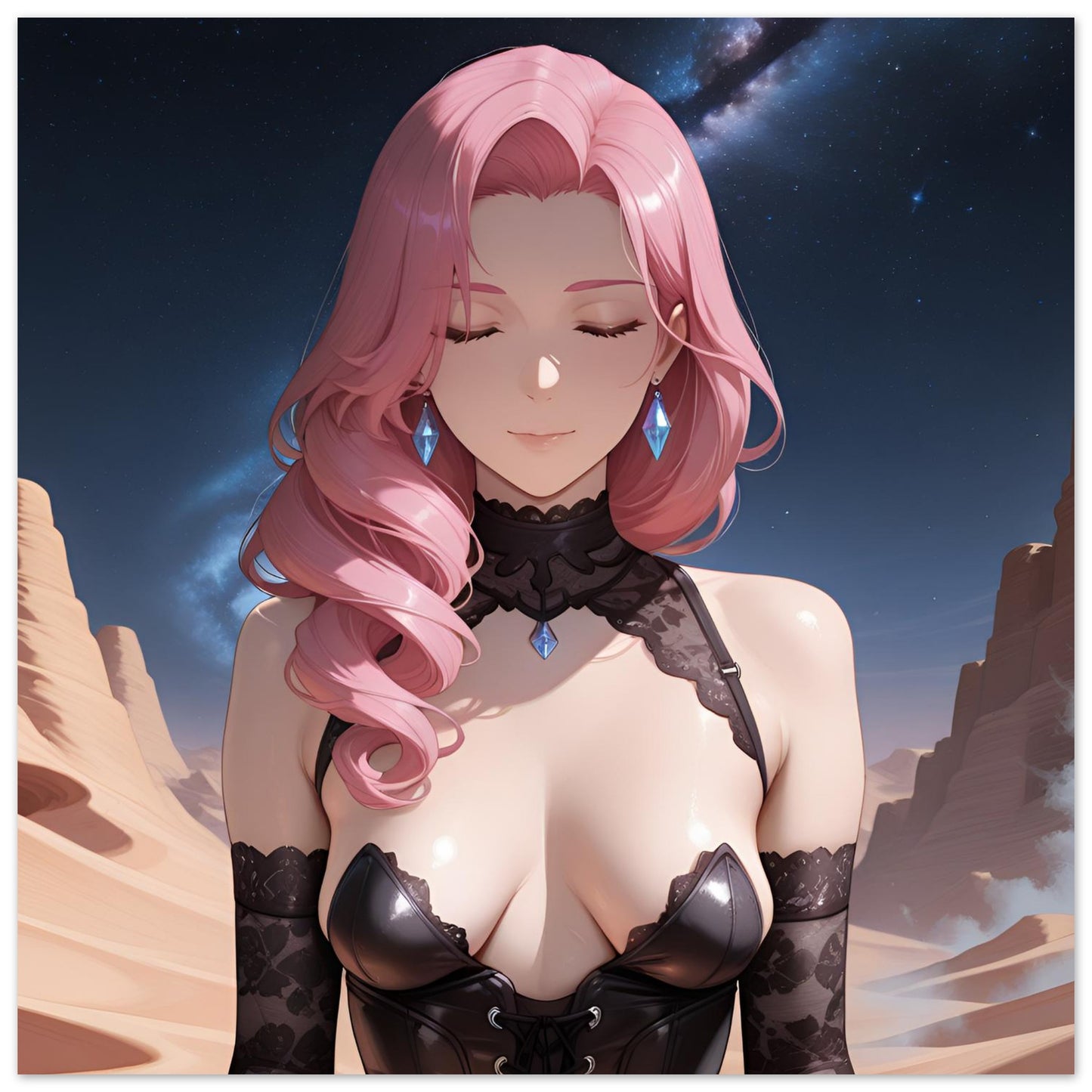 A mesmerizing anime-style artwork featuring pink wavy hair and black lace against a dramatic desert landscape. The striking night sky showcases the Milky Way, creating an ethereal atmosphere. The elegant gothic aesthetic combines with cosmic elements for a uniquely mystical design