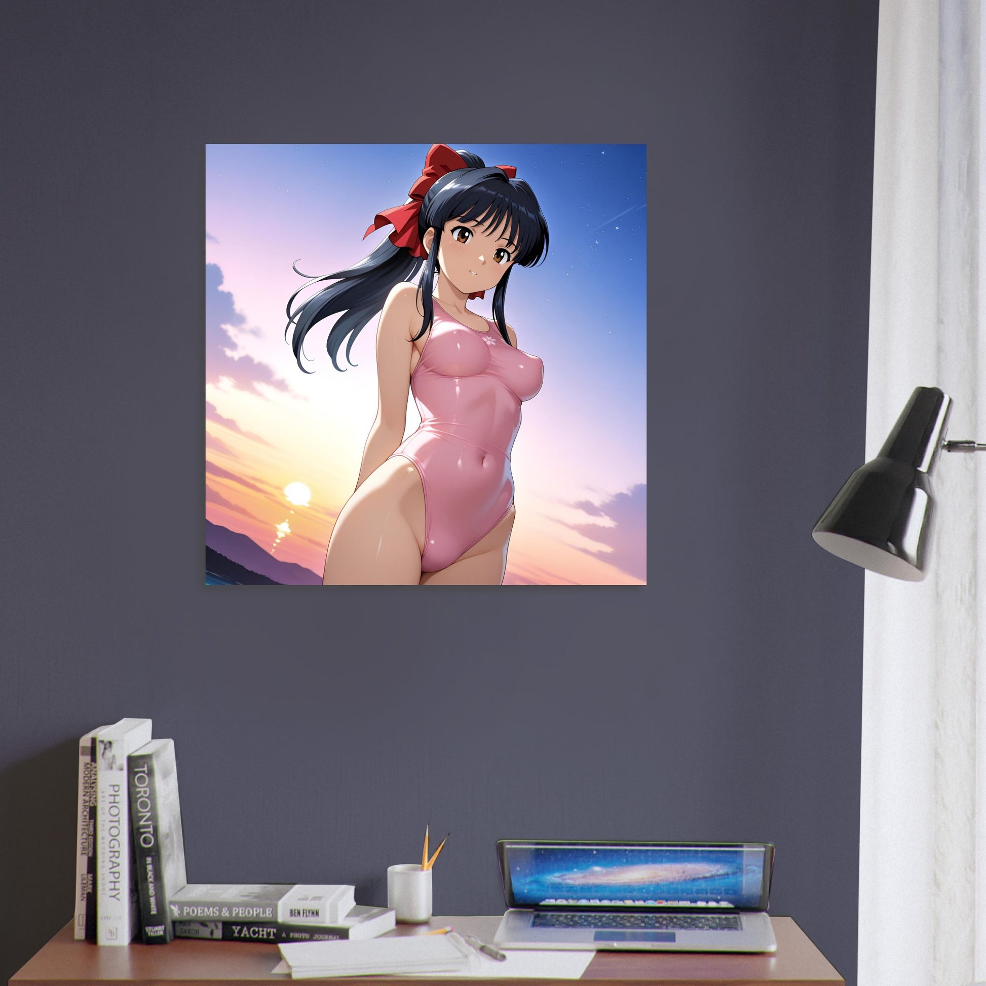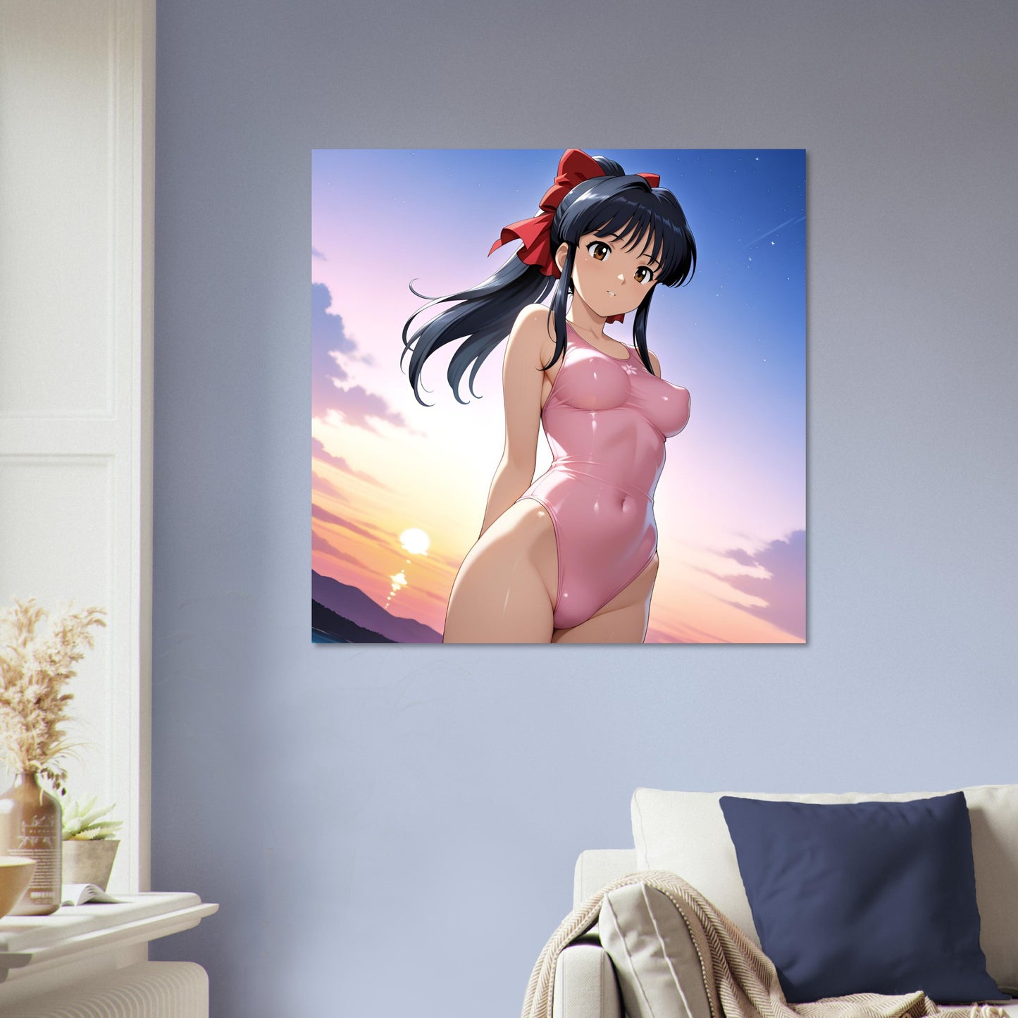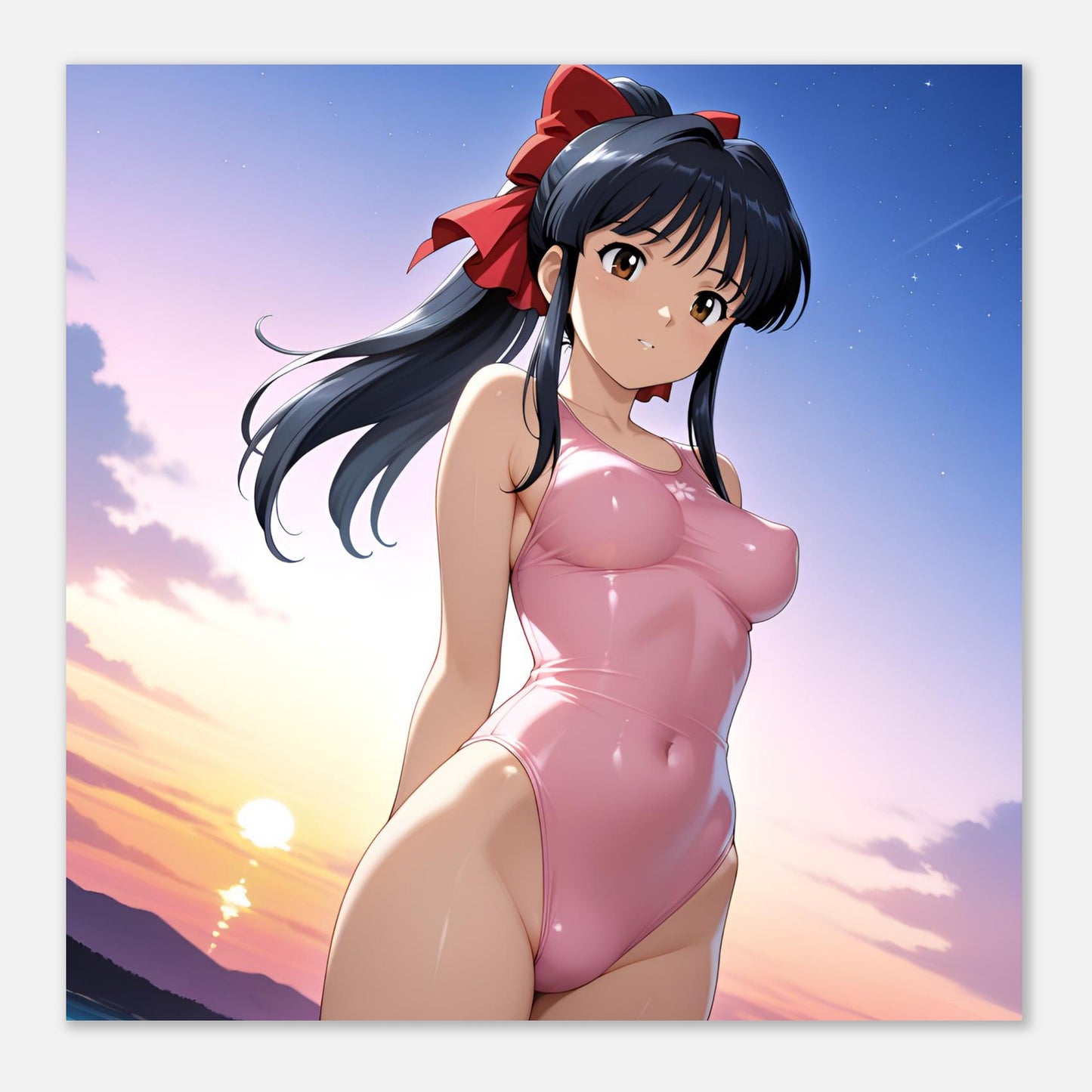 A scenic sunset artwork featuring an animated character against a dreamy twilight sky. The pink and purple hues of dusk blend beautifully with soft clouds and twinkling stars. Set against a tranquil beach backdrop with shimmering water reflections and a warm glowing sun on the horizon. The illustration style captures a perfect summer evening mood