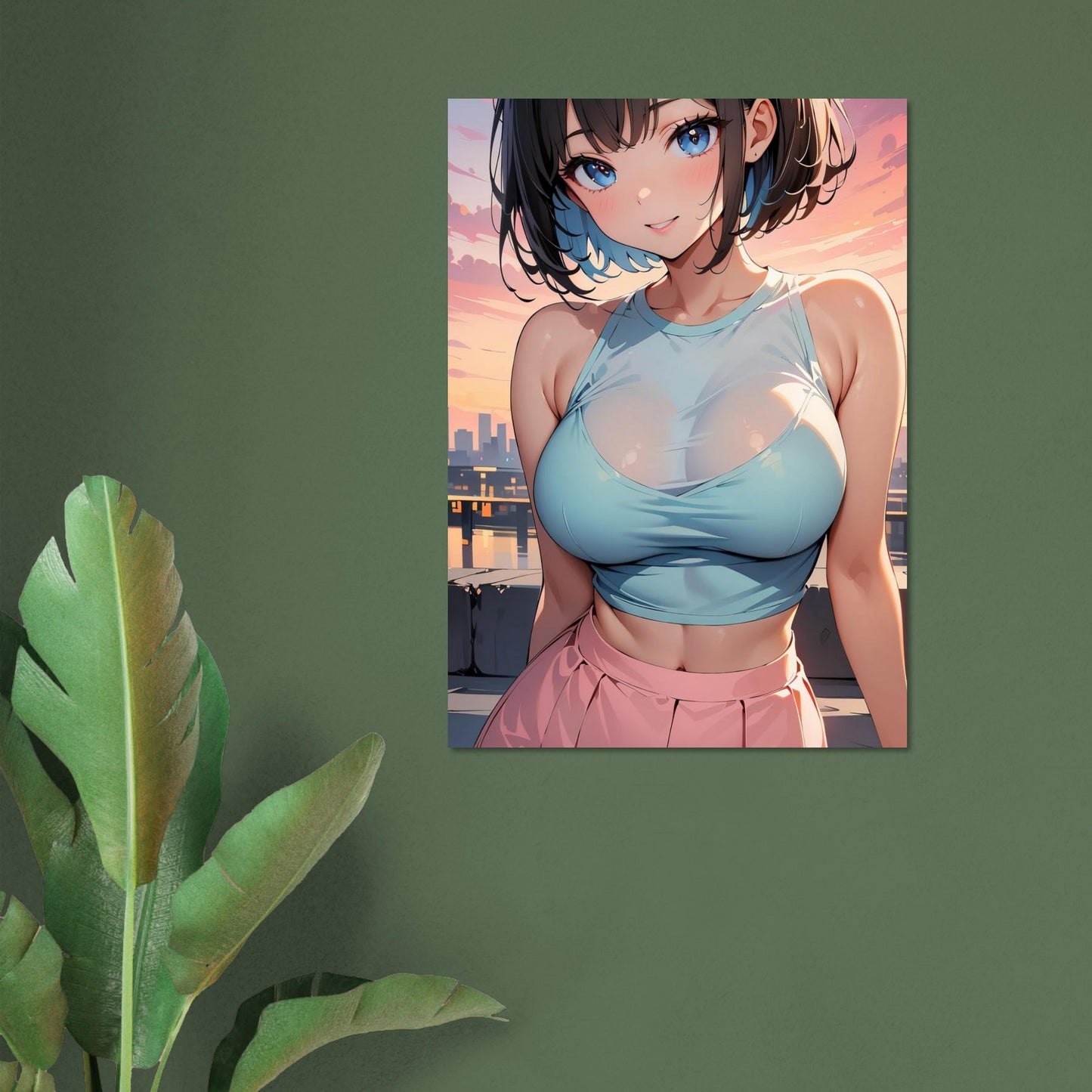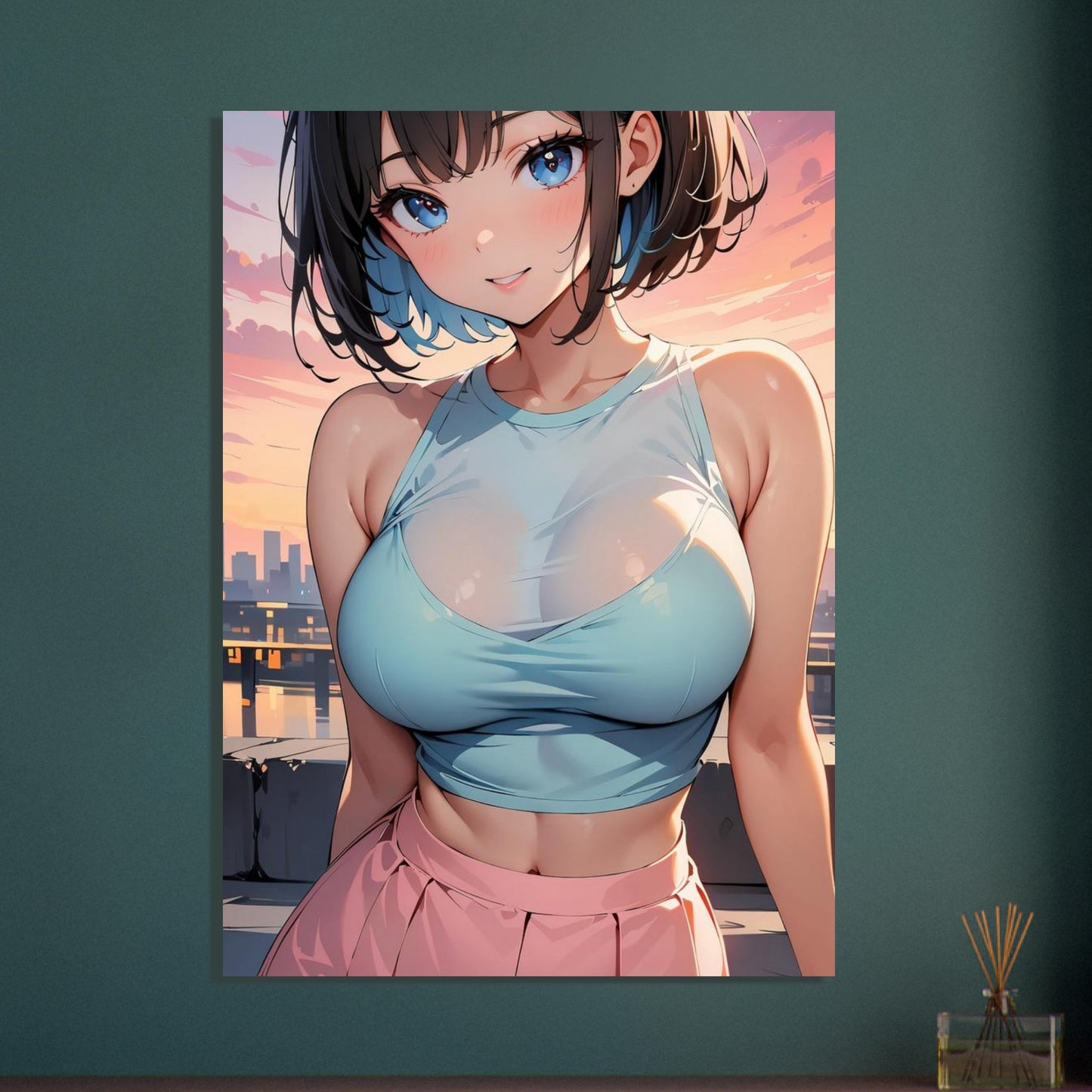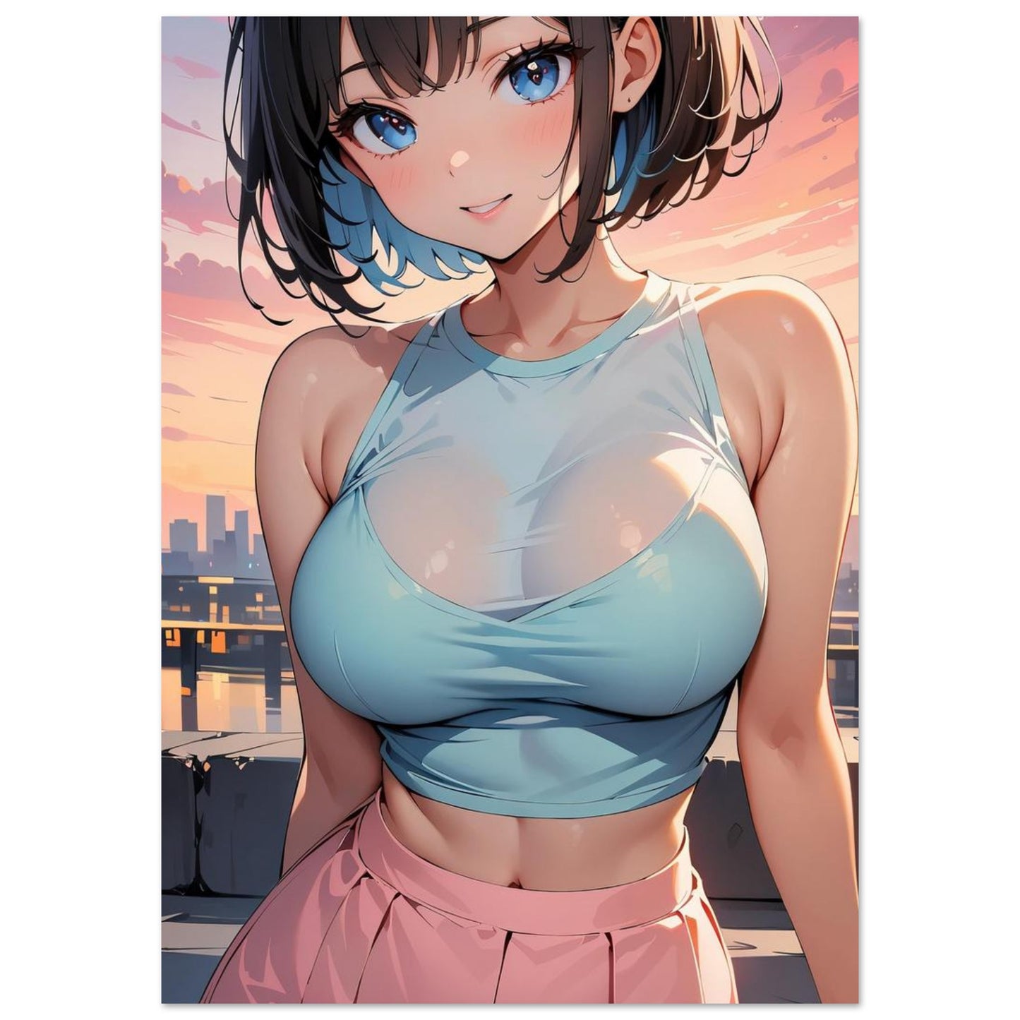 A stunning anime-style illustration capturing a sunset cityscape moment. Features vibrant pink and orange sky colors contrasting with cool blue tones. The urban backdrop showcases a modern cityline with water reflections, creating a dreamy aesthetic with Japanese animation influence